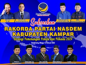 Demikian pernyataan ini disampaikan Ketua DPD Partai NasDem Kabupaten Kampar, Syamsul Muhkamar, S.Ag, dalam sambutannya ketika Rapat Koordinasi Daerah (Rakorda) Partai NasDem Kampar, di Aula Stanum Bangkinang, Kampar, Riau, Minggu (13/2/22), yang juga dihadiri sejumlah pengurus Dewan Pimpinan Wilayah (DPW) Partai NasDem Provinsi Riau, dengan mengambil tema "Strategi Pemenangan Pemilu dan Pilkada 2024".