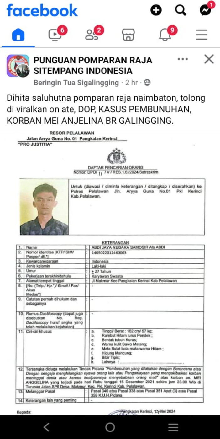Pelalawan - Terduga pelaku pembunu Mei Anjelina Boru Galingging sejak tahun 2021 lalu yang ditangani Polres Pelalawan tak kunjung tertangkap, padahal Polisi sudah mengeluarkan surat Daftar pencarian Orang (DPO) kepada terduga pelaku.